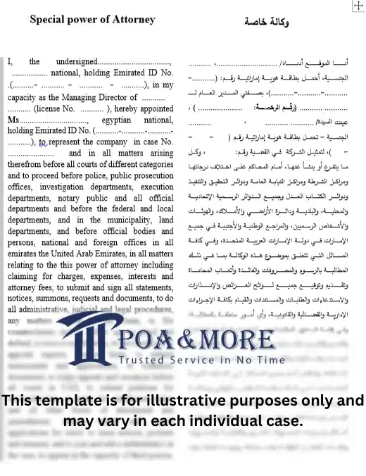 Специальная доверенность от Дубая— это юридический документ, который дает адвокату полномочия действовать от имени доверителя в конкретном и определенном деле. Это может быть продажа имущества, управление банковским счетом или представительство в судебном деле, среди прочего. В следующих строках мы объясняем, почему вам следует выбрать форму специальной доверенности от POA&More: